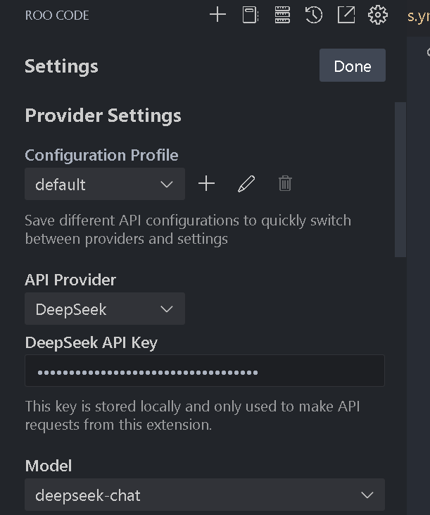 VS Code插件市场检索 Roo Cline,定位对应插件点击安装即可,该插件为 Cline的分支,二者可以共存。 安装完成后将上述API key配置到Roo Cline即可。Cline支持规划和编程使用不同的模型,这里为了测试都使用DeepSeek-V3,实际应用中可以考虑DeepSeek-R1规划,Claude-3.5-Sonnet编程。