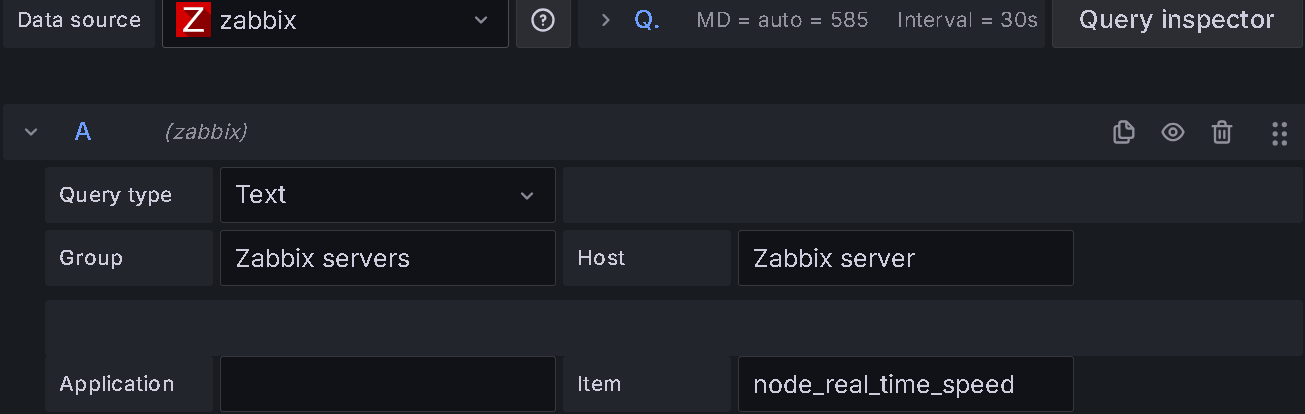 grafana支持多种数据源,这里 Data source选的zabbix(IData中的监控数据都记录在zabbix,详情见IData监控系统架构),示例为各节点实时下载速度的趋势图,所以监控项选择 node_real_time_speed