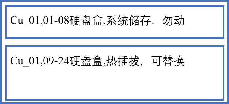 cu_01节点共计24个硬盘槽,01-08为储存系统文件的硬盘,不可移动,09-24共计18个硬盘槽,可以热插拔移动,对应于硬盘对应关系在线表格中第一列的cu01_09到cu01_24标示。