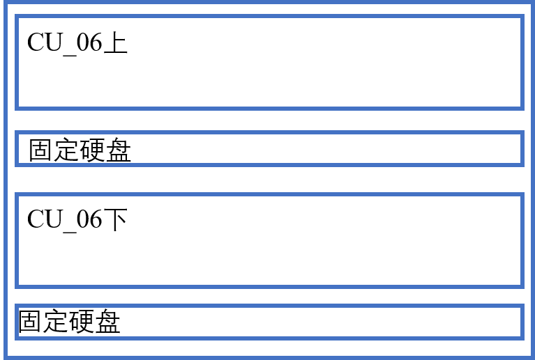 cu_06节点共计24个硬盘槽,共计为六层,分别为第一层为对应于硬盘对应关系在线表格中的cu06_00(上)到cu06_03(上),第二层为对应于硬盘对应关系在线表格中的cu06_04(上)到cu06_07(上),第三层为固定硬盘,第四层为对应于硬盘对应关系在线表格中的cu06_00(下)到cu06_03(下),第五层为对应于硬盘对应关系在线表格中的cu06_04(下)到cu06_07(下),第六层为固定硬盘,每层四个硬盘槽
