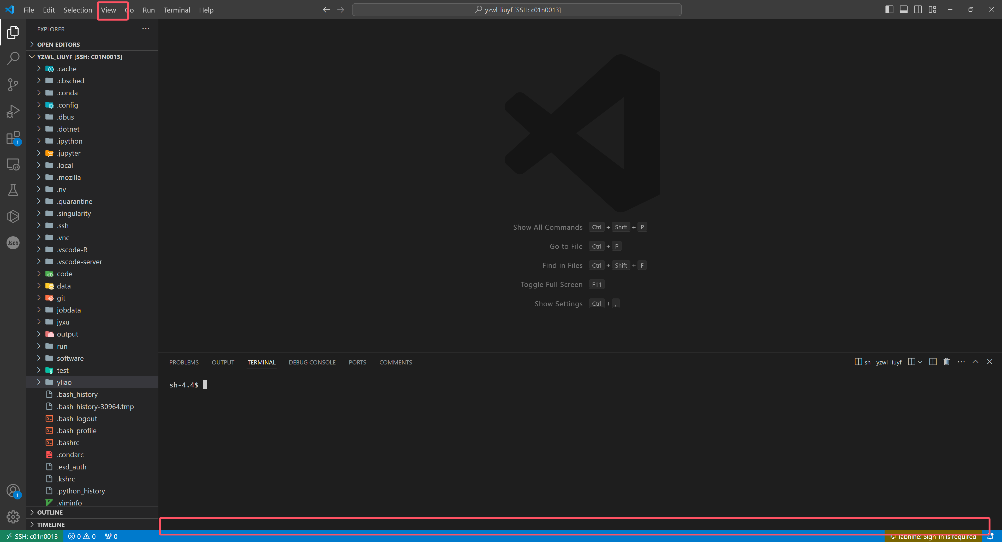 • 调出终端:可以从下方红框所示区域点击向上拉,部分无法操作可点击左上角「视图」-「终端」