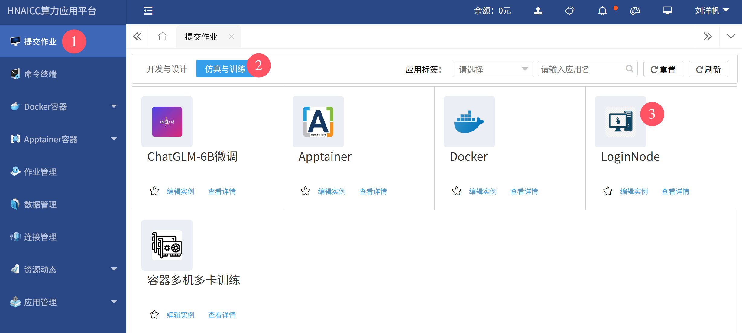 • 依次点击「提交作业」-「仿真与训练」-「LoginNode」