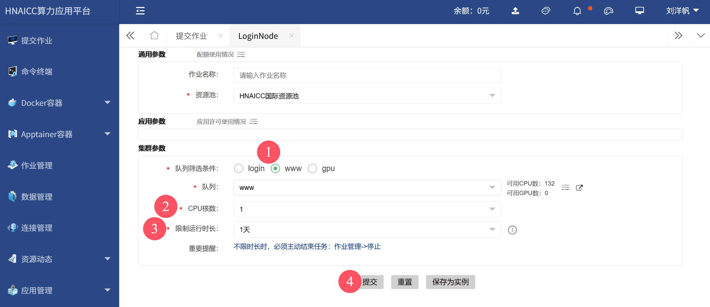• 「队列:www」-「CPU核数:1」-「限制运行时长:1天」-「提交」