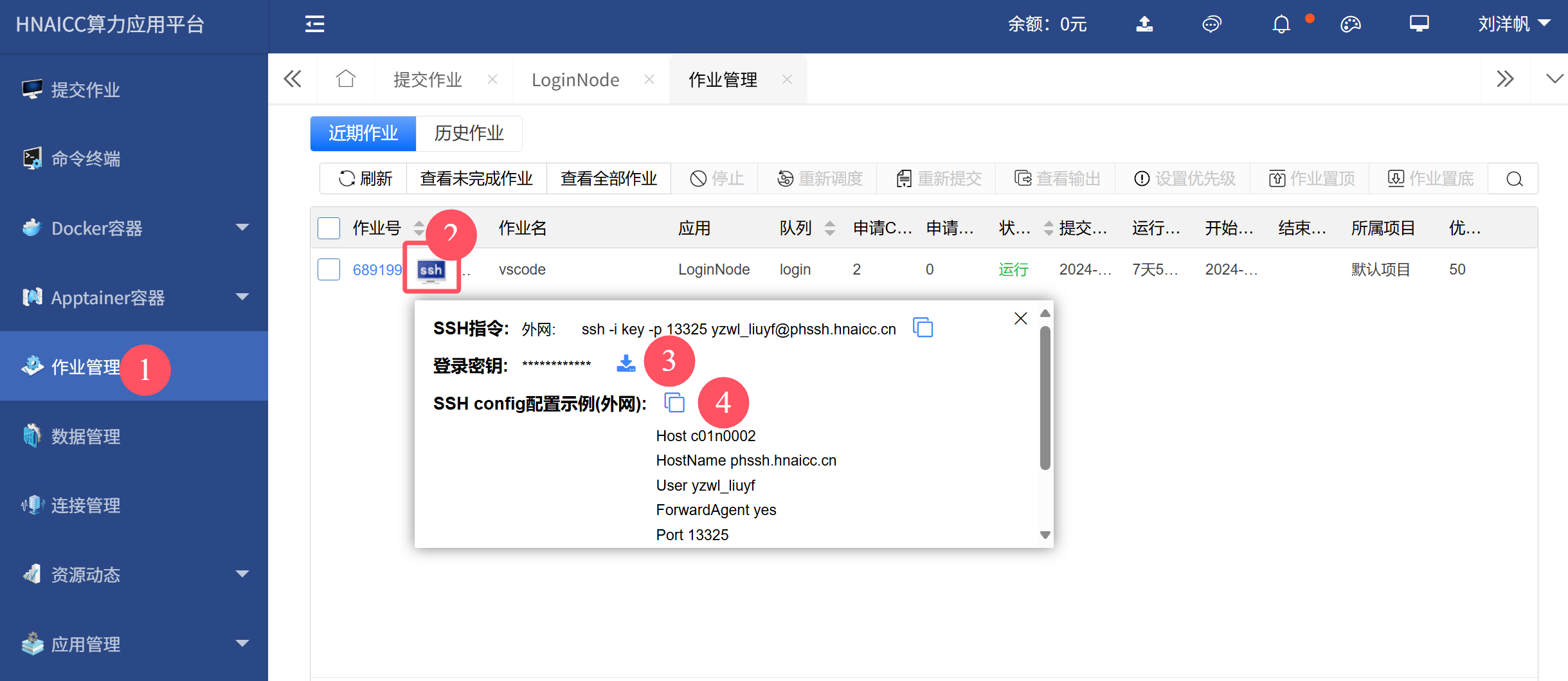 • 依次点击「作业管理」-「ssh图标」-「下载登录密钥」-「复制SSH config配置示例」
