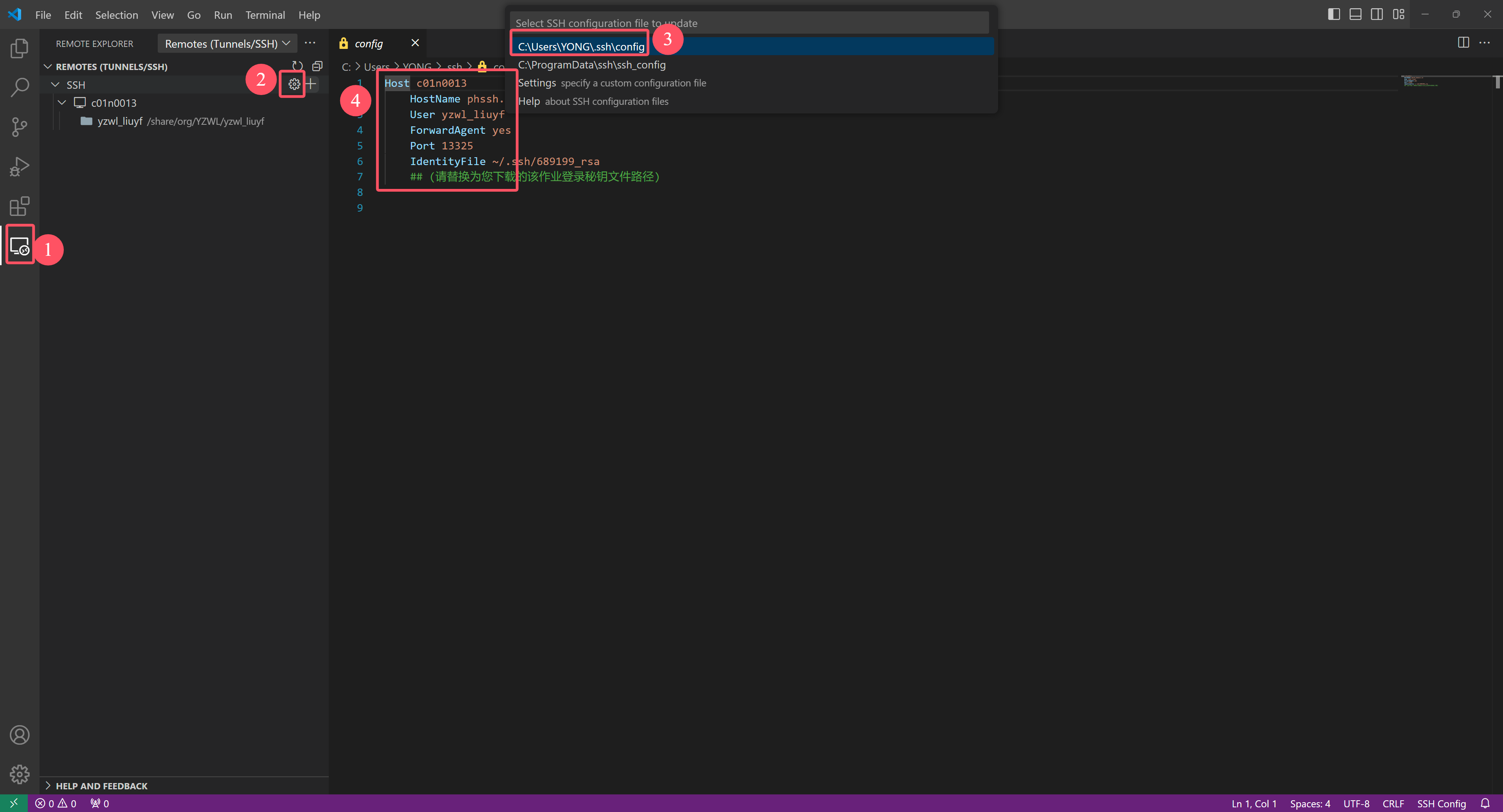 • 选择左侧「Remote」-「SSH右侧的设置」-「第一条.ssh」,粘贴「SSH config配置示例」到此处保存即可
